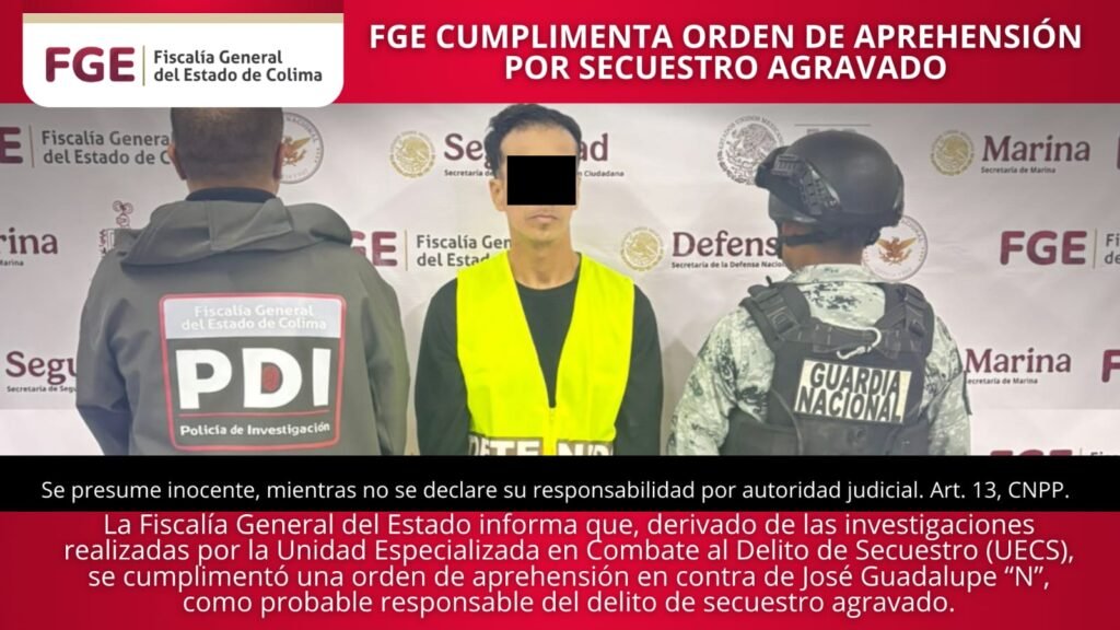 La Fiscalía General del Estado informa que, como resultado de las investigaciones realizadas por la Unidad Especializada en Combate al Delito de Secuestro (UECS), se cumplimentó una orden de aprehensión en contra de José Guadalupe “N”, como probable responsable del delito de secuestro agravado. De acuerdo con las indagatorias, los hechos ocurrieron el 1 de […]