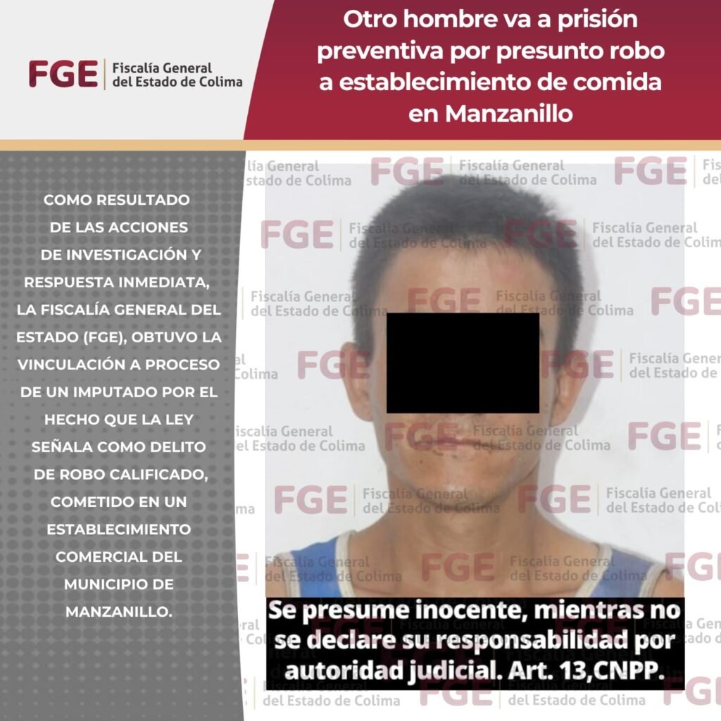 Otro hombre va a prisión preventiva por presunto robo a establecimiento de comida en Manzanillo