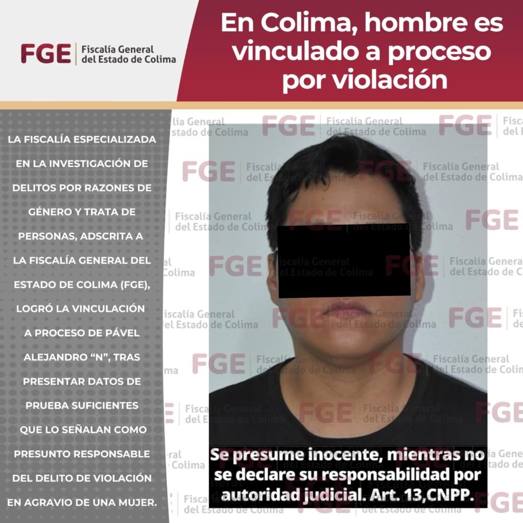 La Fiscalía Especializada en la Investigación de Delitos por Razones de Género y Trata de Personas, adscrita a la Fiscalía General del Estado de Colima (FGE), logró la vinculación a proceso de Pável Alejandro “N”, tras presentar datos de prueba suficientes que lo señalan como presunto responsable del delito de violación en agravio de una […]