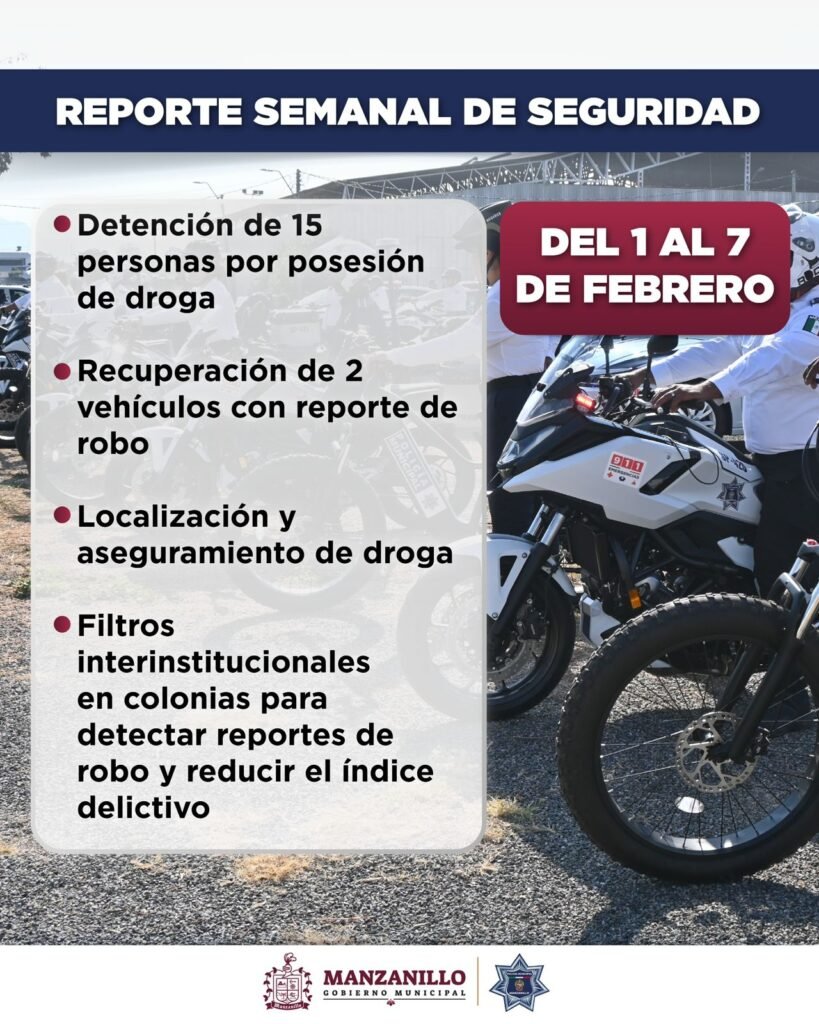 La Dirección de Seguridad Pública de Manzanillo informó que, como resultado de los patrullajes permanentes y operativos preventivos realizados en distintas colonias del municipio, se logró la detención de 15 personas, presuntamente relacionadas con delitos contra la salud, entre ellos el consumo y la posible distribución de sustancias ilícitas. Durante estas acciones, también se recuperaron […]