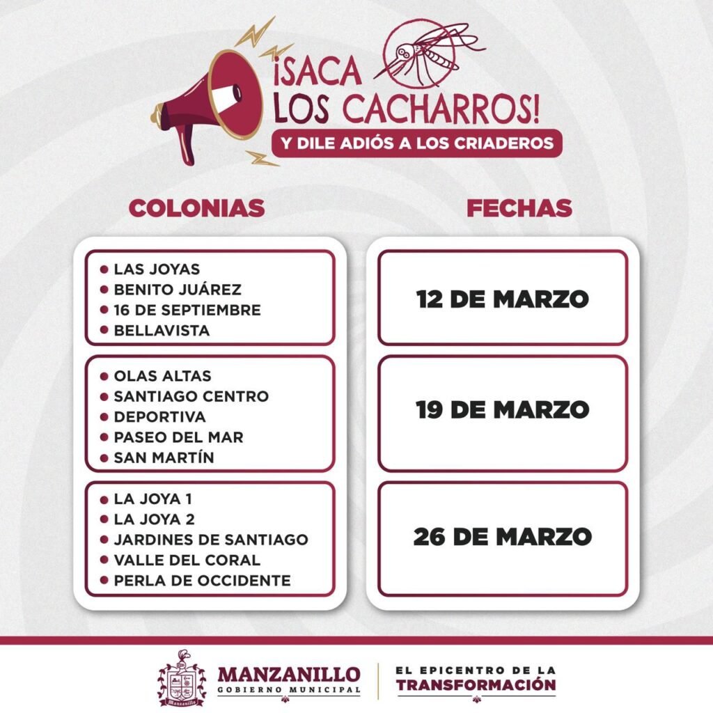 Con el propósito de eliminar criaderos de mosquitos y fortalecer la prevención del dengue, el Gobierno de Manzanillo, encabezado por la presidenta Rosi Bayardo, continuará con las jornadas de descacharrización en distintas colonias del municipio. Las brigadas estarán presentes el 12 de marzo en Las Joyas, Benito Juárez, 16 de Septiembre y Bellavista; el 19 […]