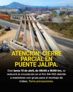 Seidum Colima anuncia cierre parcial en el puente Jalipa para montar trabes, este lunes de 8 am a 6 pm