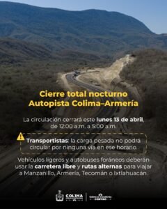 Alerta Seidum por cierre total nocturno de la autopista Colima-Manzanillo, de 12 de la noche a 5 de la mañana este lunes
